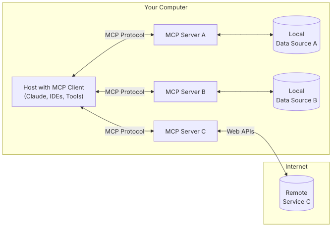 This diagram provided by MCP illustrates how a Host application with an MCP Client (like Claude or an IDE) connects to multiple MCP Servers. Each server interfaces with either local data sources or remote APIs, enabling dynamic, protocol-driven interactions between AI models and external tools or services.