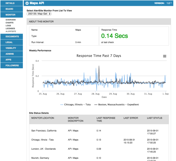 AlertSite is integrated with the Akana’s Community Manager to give you a complete, end-to-end view of how well your API is performing through one user interface. You get robust monitoring internally and externally. The Akana platform offers inside- out monitoring and analytics. Add to that AlertSite’s global monitoring reach for the outside-in. Below is an example of the analytic data brought back from AlertSite and displayed inside Akana’s Community Manager. As an API Provider, you can quickly understand how well your API is performing locally and globally through an integrated experience and you are able to take actions.