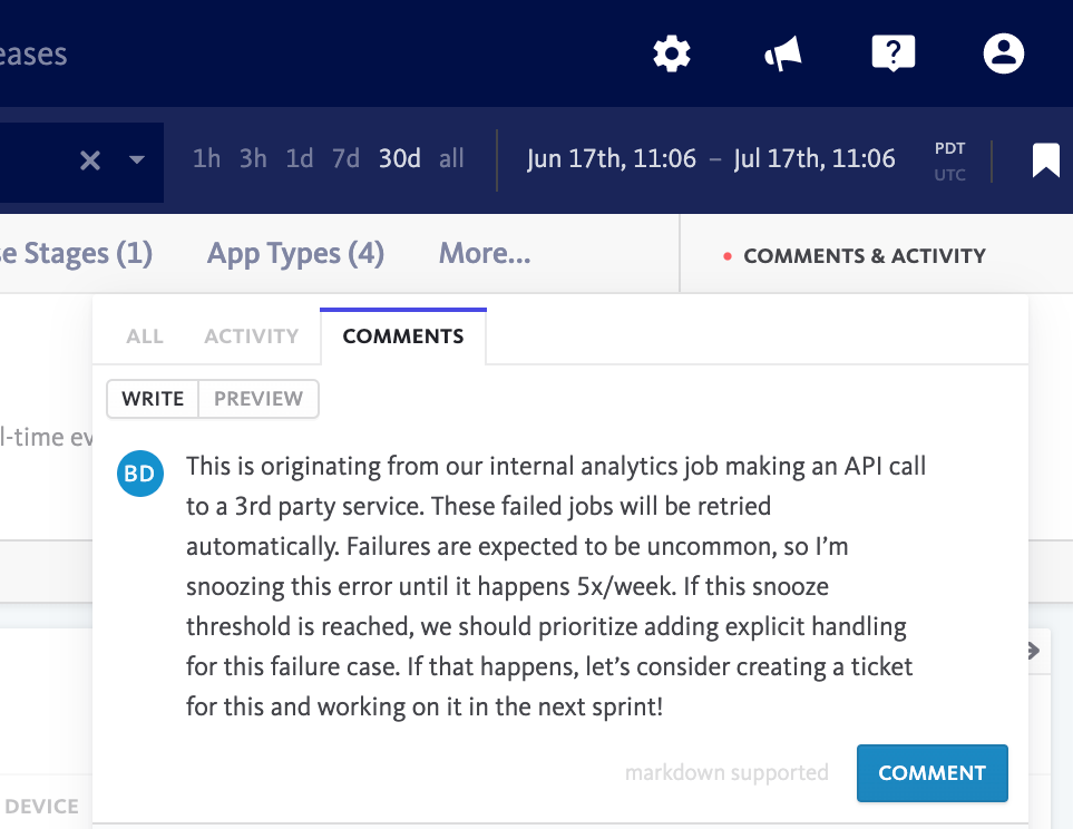 When triaging, whether you decide to snooze an error, create an issue for it, or take another workflow action, it’s often valuable to add a comment detailing your thought process.