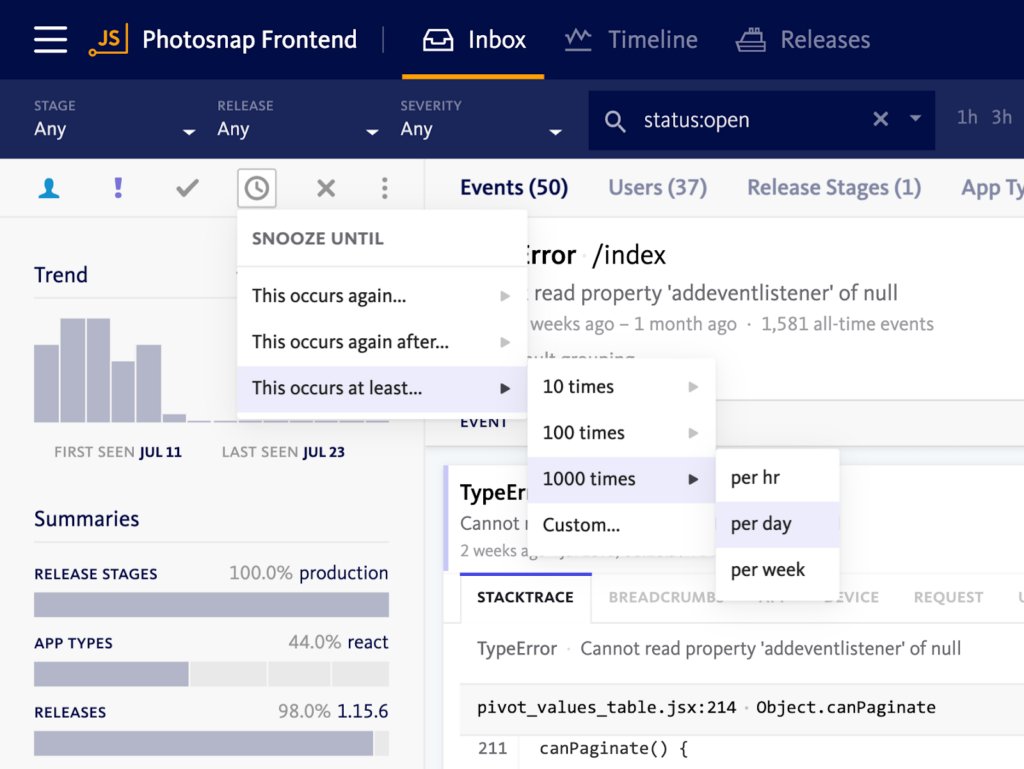 Once you’ve snoozed an error, it will only return to the “for review” state if the snooze threshold you specified is reached. At this point, it’s often worth prioritizing a fix.