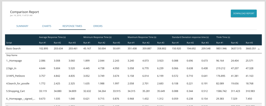 3. Response Time: This shows users granular time-based statistics for different metrics across scripts and steps for different runs. Some of these metrics include standard deviation of response times, maximum response times, connect time and think times.