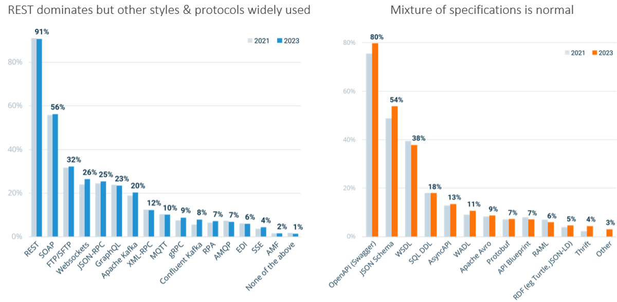 The modern-day integration landscape for most organizations has become more complex. We are dealing with increasing API numbers, shifts toward composable architecture approaches, increasing variety in styles and patterns, increasing variety in technical specifications, protocols, and software stacks. In examining some of the findings from SmartBear’s report on the State of Software Quality API 2023, I don’t think it will surprise anyone that REST continues dominating API style preferences. However, we continue to see an increase in those using multiple different protocols, technologies, and API styles (~81% more than one with ~57% using three or more). Additionally, this complexity is set against the backdrop of teams being more distributed than ever, and there being fewer skilled people available to keep up with demand.