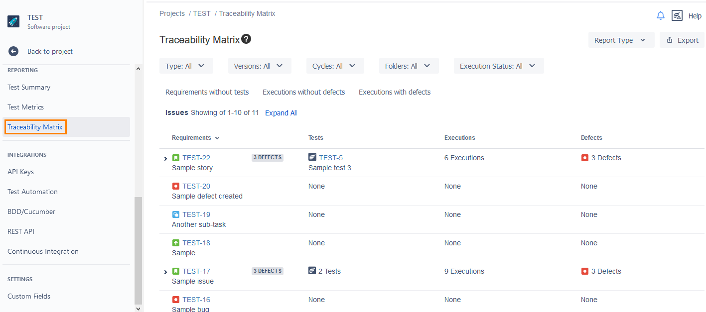 For example, Zephyr’s Traceability Matrix reports trace links between requirements to defects. In addition to helping testers and managers make go/no-go decisions and prioritize work, these reports can help support end-of-release audit reports for compliance or regulatory reasons, or may be provided as a deliverable to stakeholders to verify coverage.