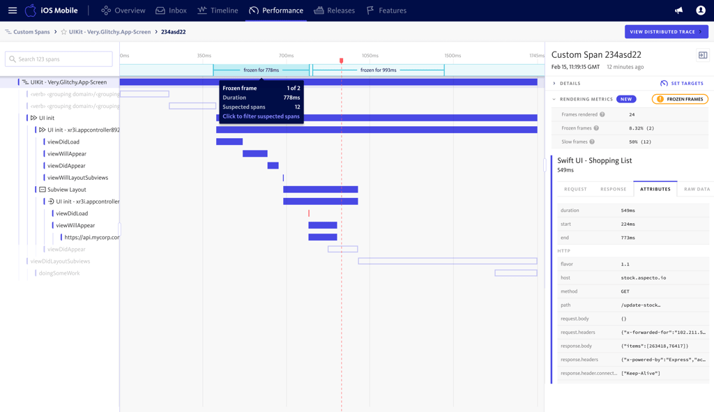 Using BugSnag’s performance monitoring feature, you can clearly see rendering issues related to slow and frozen frames in spans reported by the app and easily track the root cause.
