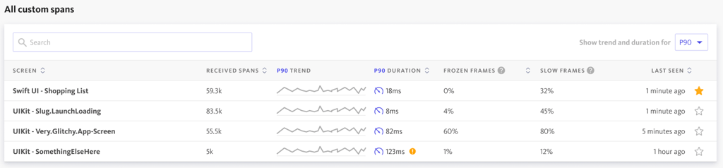 Let’s look at a sample iOS application. For each custom span group, a user can see an aggregated metrics at a glance. This view shows the percentage of frozen frames (% of qualified spans where at least one frame render exceeded 700ms) and slow frames (% of qualified spans where ≥25% of frames missed the rendering deadline.