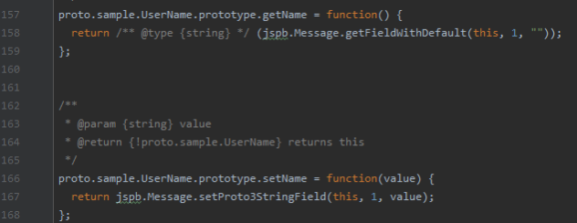 Here’s an example of some auto-generated code for the “UserName” message above in JavaScript. gRPC supports many languages in addition to JavaScript. The ”Username ” object was created, along with some setters and getters.