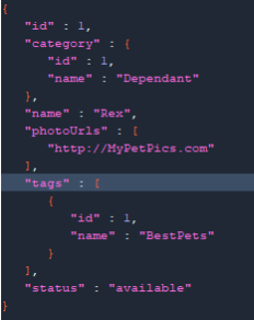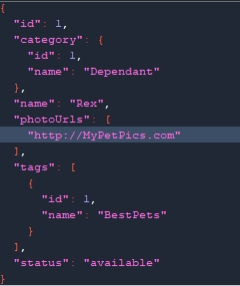 This creates a new “Pet” for a petstore API by providing Pet information in JSON format. The API returns a 201 or 200 HTTP status code message, indicating the transaction was successful, and returns the JSON data that was posted. Depending on the implementation, there may be additional data received as JSON.