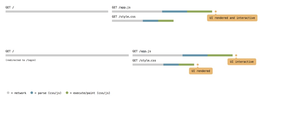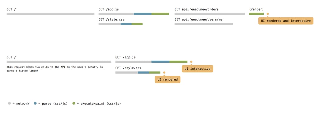 Let’s look at this from another angle, laying out the critical path to a rendered UI and an interactive UI. Rendered means the user’s browser tab is populated with all the content they’d expect — for example, seeing the list items on their order. Interactive means providing user input to the page will result in the expected behaviour — for example, clicking a ╳ button or pressing the ESC