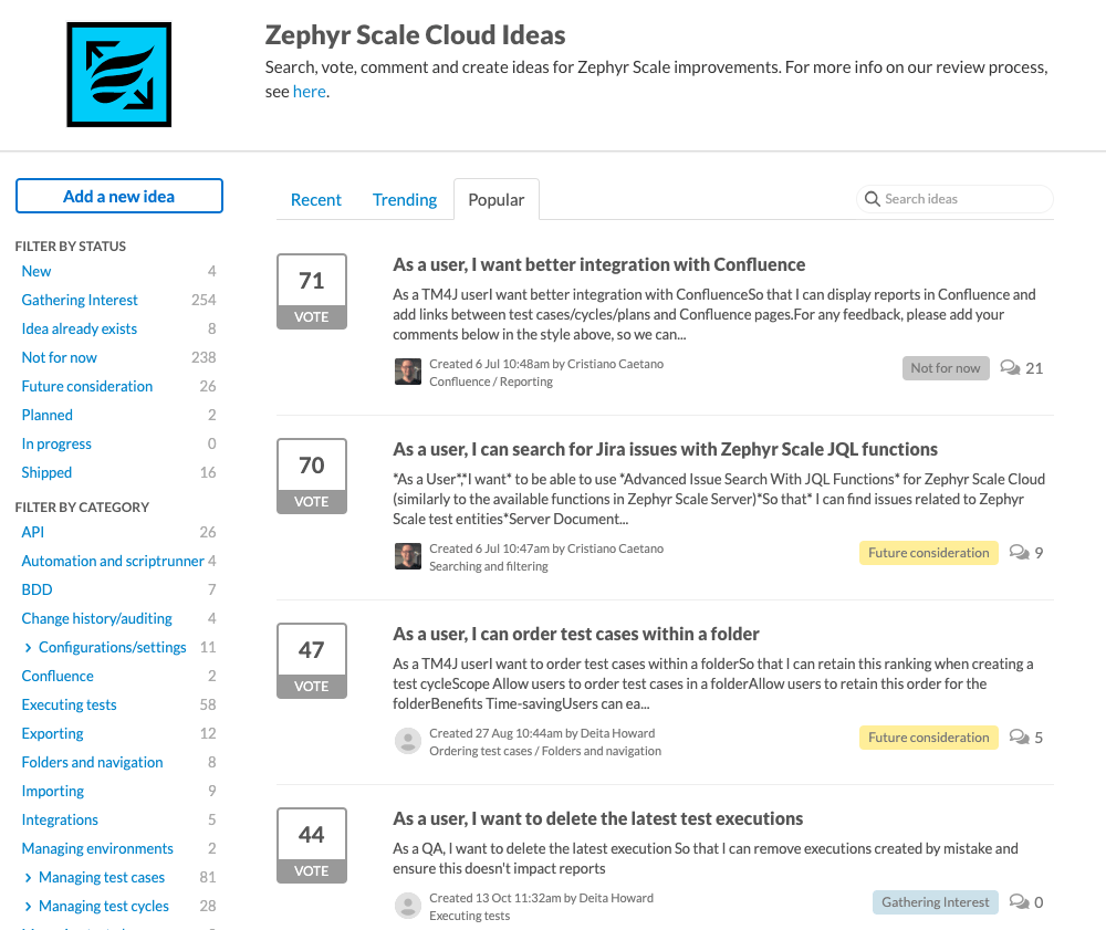 Our roadmaps are public, and you can influence them through the dedicated Ideas Portals for Zephyr Squad, Zephyr Scale, and Zephyr Enterprise. Not only you can submit your feature ideas there, but you can also vote and comment on features requested by other users, making Zephyr roadmap a truly collaborative process.