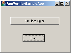 Now we can see how you can use the Application Verifier and TestComplete together. To demonstrate this, we will use a sample Visual C++ application named AppVerifierSampleApp (please find thedownload link below). The application’s main window contains two buttons: Simulate Error and Exit: