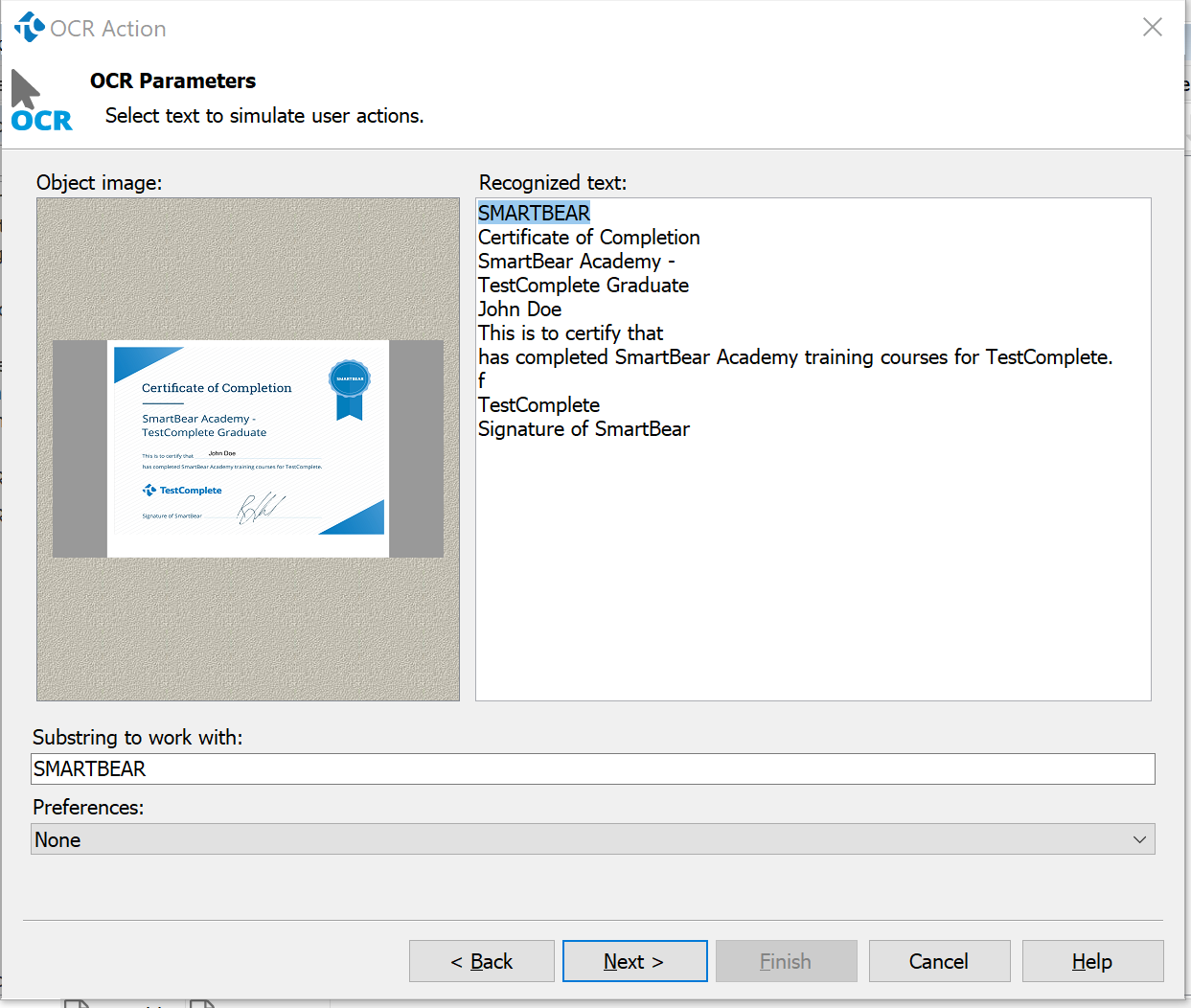 Elements identified using OCR simplify test script maintenance by providing another reliable identification method for hard to test objects. OCR element data can be analyzed as full text or in separate blocks based on the needs of your script. Additional options such as custom search, regular expressions, and text fragment selection allow fine-tuning the use of OCR data.